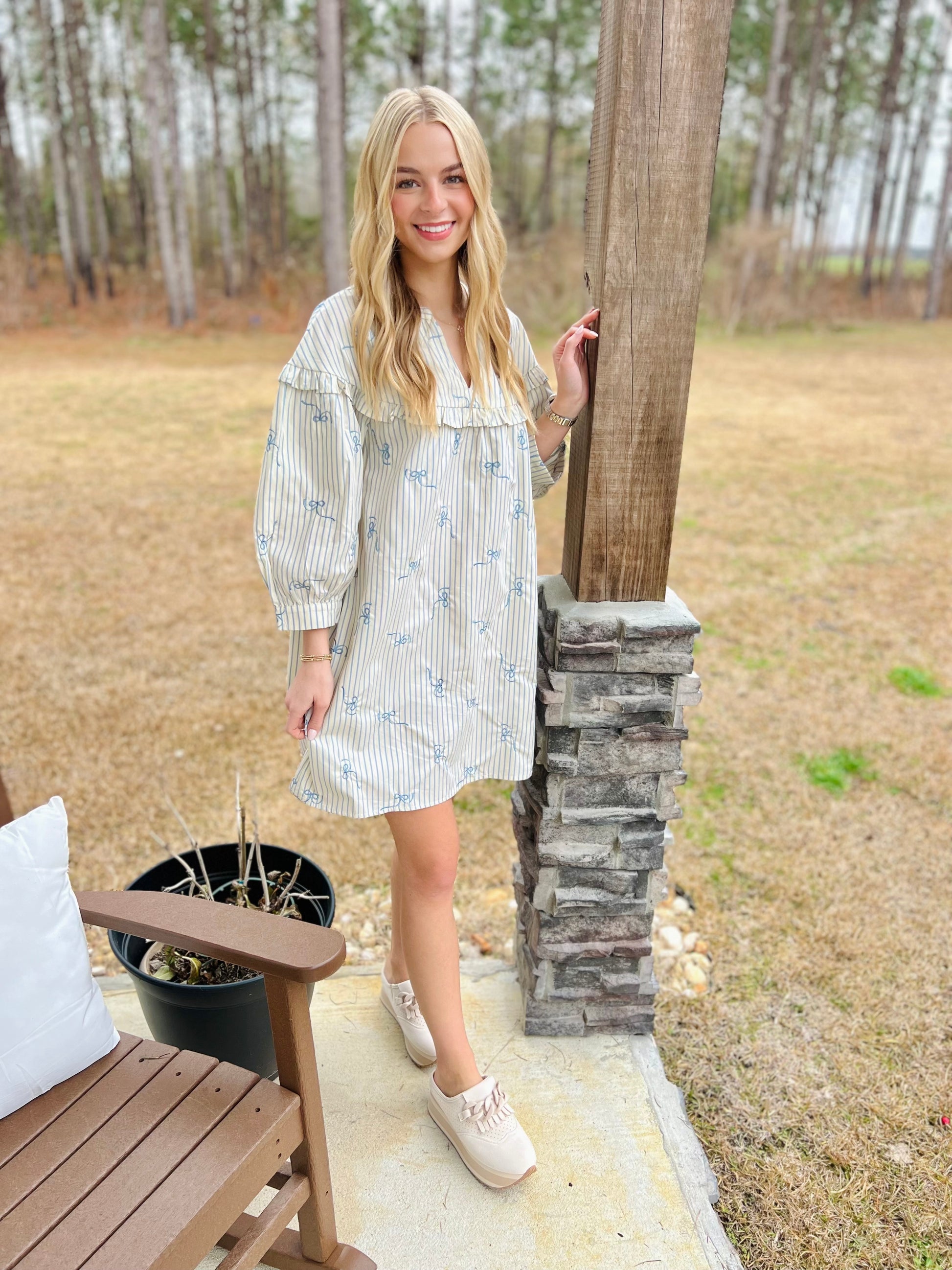 The Ava Bow Dress features a timeless off-white design accentuated with delicate light blue stripes and charming embroidered bows. With expert craftsmanship and attention to detail, this dress embodies elegance and sophistication for any occasion. Perfect for those seeking a classic, yet unique look. Katelyn is wearing a small.
