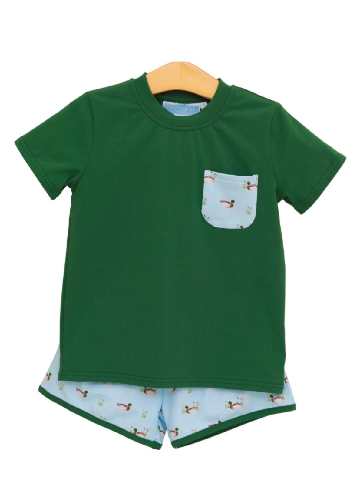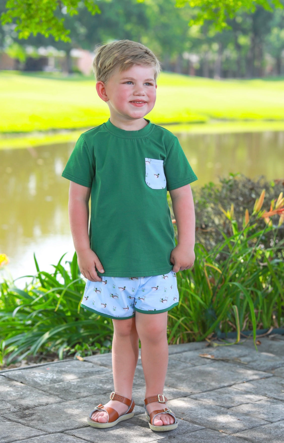 Your little one will look effortlessly stylish in our Ducks In A Row—the perfect blend of comfort, charm, and classic southern style. This two-piece set features a rich forest-green short sleeve tee paired with soft coordinating shorts adorned in a playful mallard duck print.