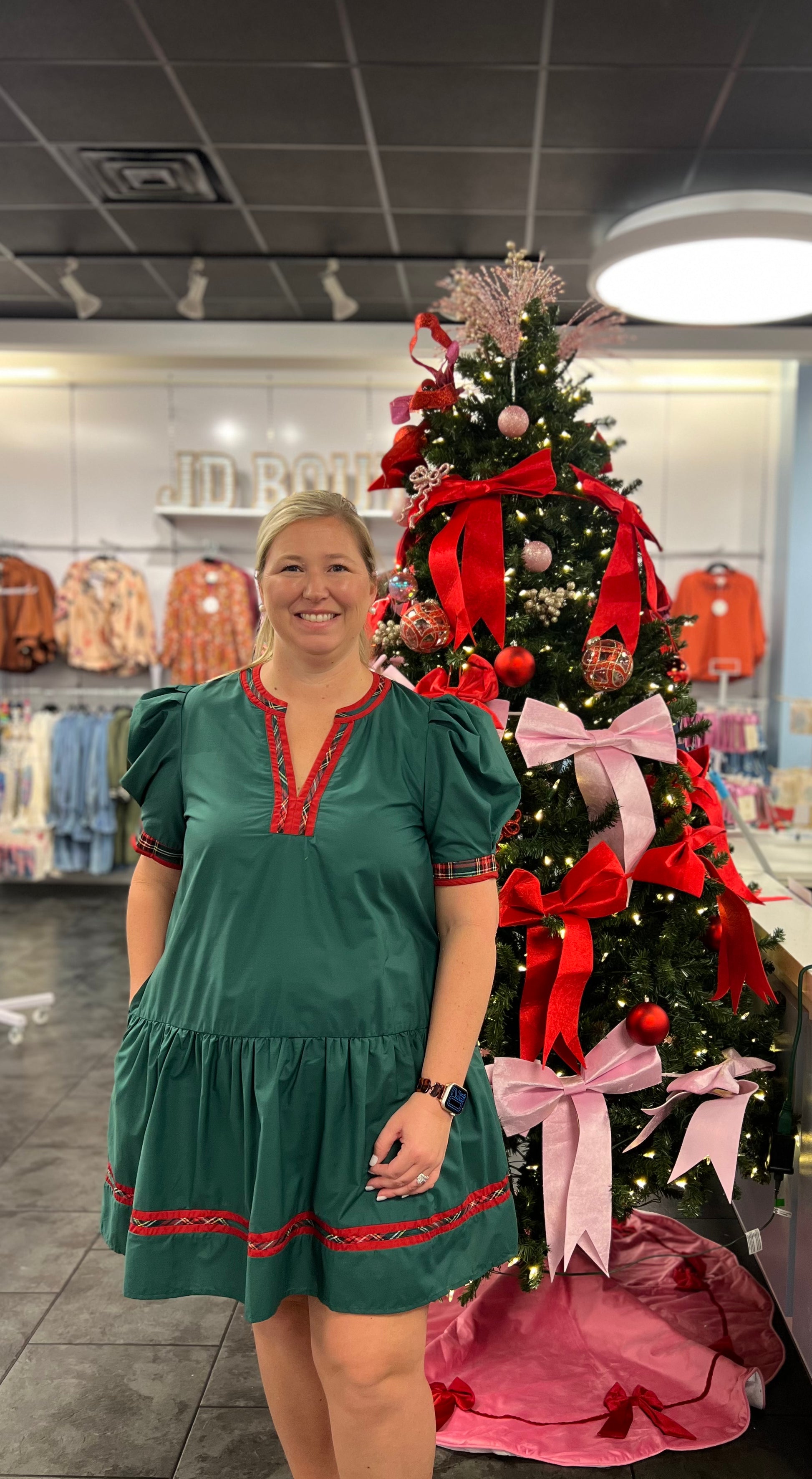 Looking for a statement piece that will turn heads? The Emerald Radiance Dress is the perfect choice. This stunning green dress features small red and plaid detailing around the sleeves, collar, and bottom, adding a touch of excitement to your look. Elevate your style with this unique and bold piece.