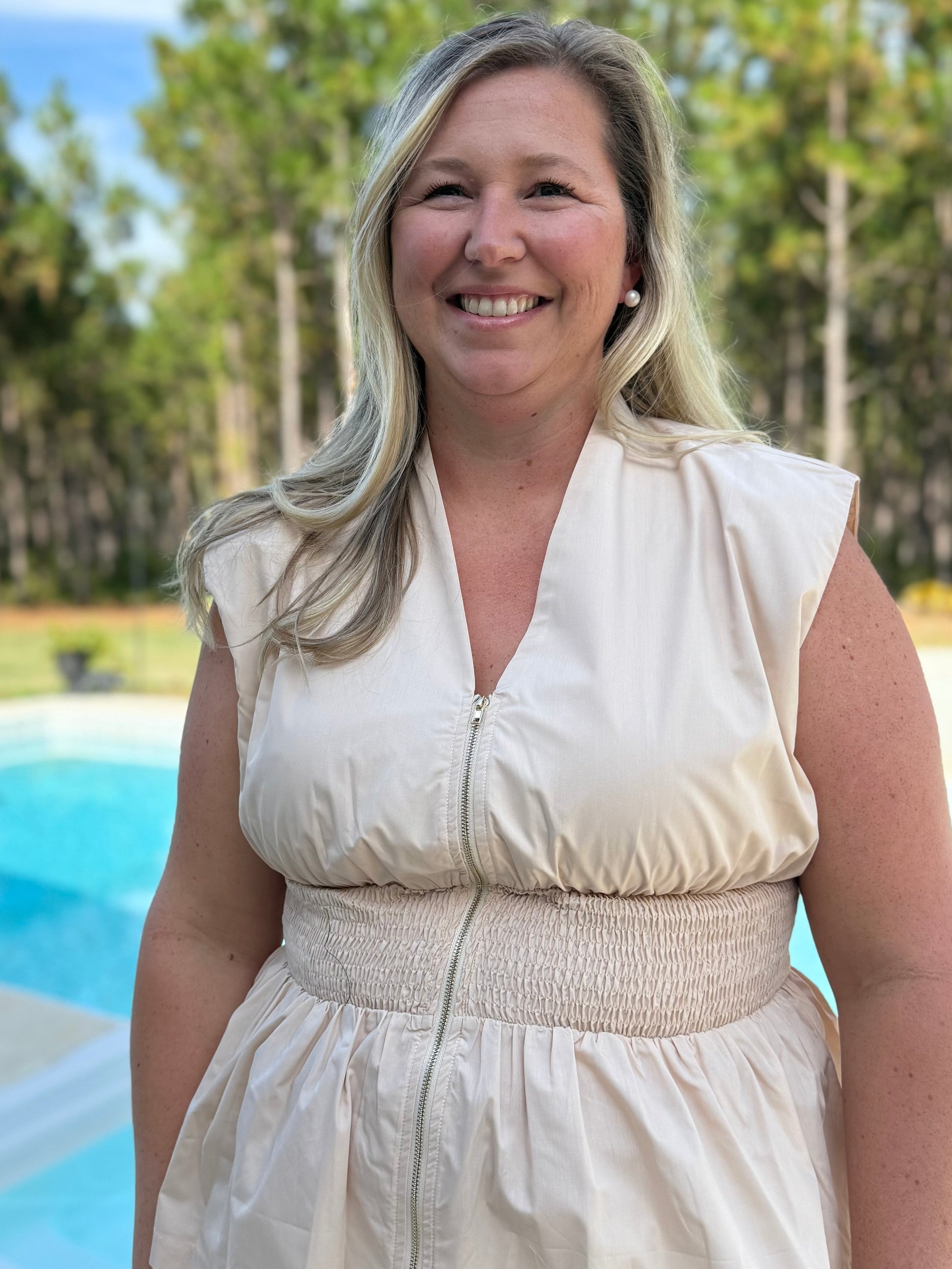 Elevate your style with The Sandy Chic Top! This cream-colored piece features a gold zipper and stretchy middle for a comfortable and dressy fit. Perfect for any occasion, its clean and fancy look will add a touch of sophistication to your wardrobe. Embrace this cute and versatile top for a chic and put-together look.