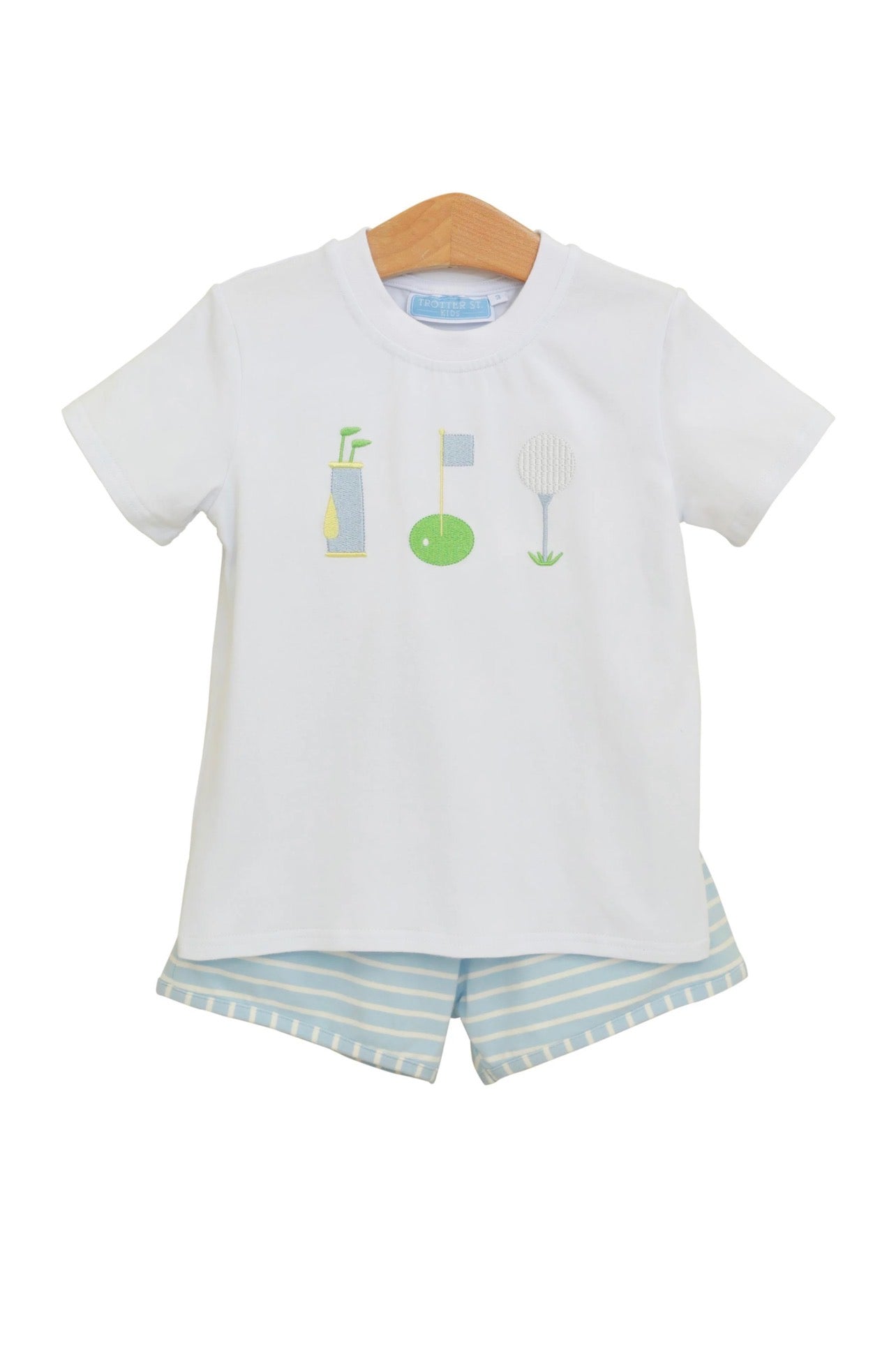 Bring a touch of charm and classic style to your little one’s wardrobe with our Tee Time Short Set. This sweet two-piece outfit features a soft, breathable top with beautifully stitched golf-themed embroidery—including a tee, flag, and club—paired with coordinating bottoms for a perfectly polished look.